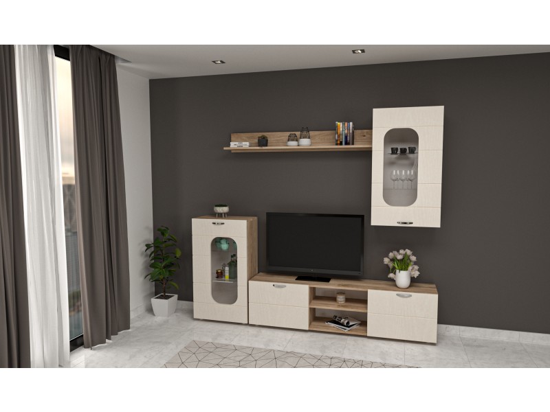 Изработка: Медијапан фолија златен јасен (лице) со висококвалитетна иверка 16 мм даб (корпус) , стаклени полици .