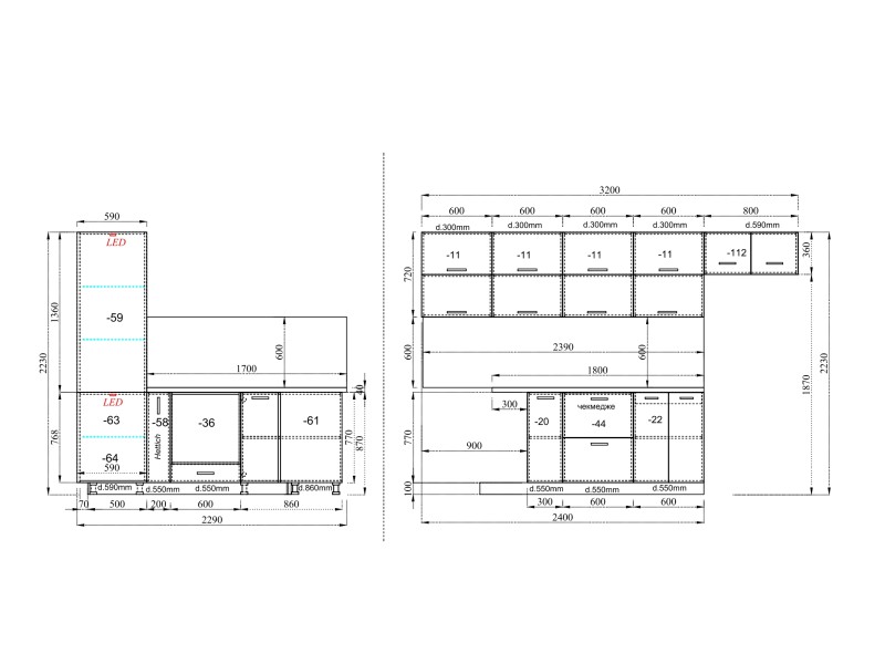Долен ред: 240 x 60 x 223 cm (55 cm длабочина на елементите)