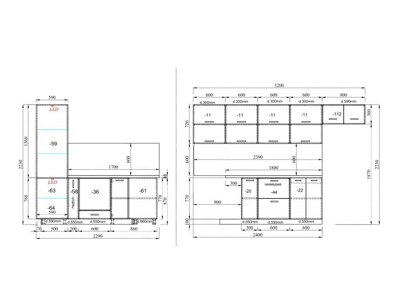 Долен ред: 240 x 60 x 223 cm (55 cm длабочина на елементите)