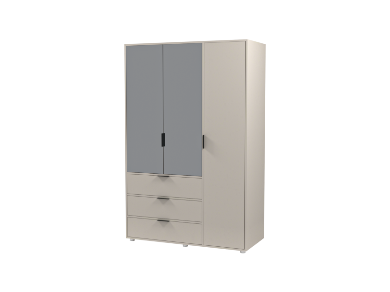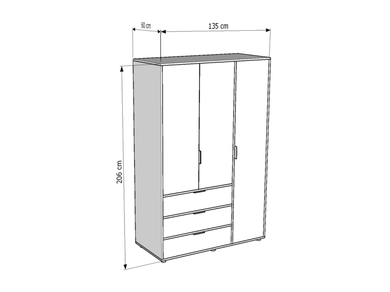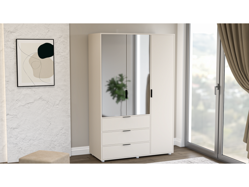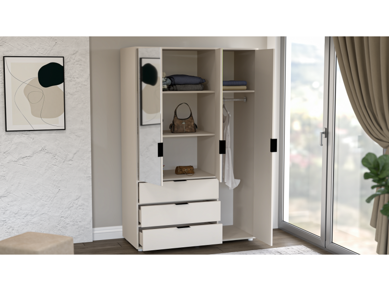 Изработка: Трокрилен ормар изработен од висококвалитетна иверка со дебелина од 16mm, со три фиоки и со огледало на две врати.