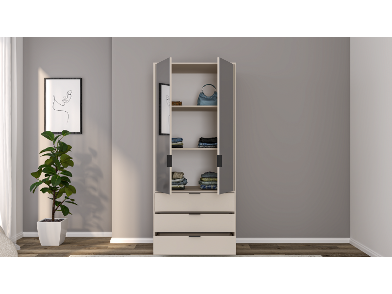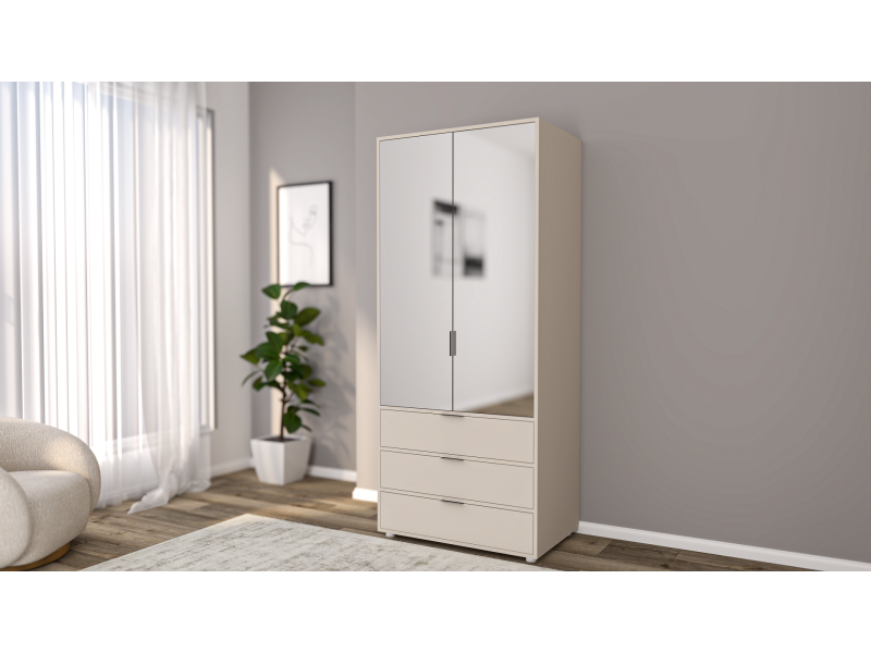 Изработка: Двокрилен ормар изработен од висококвалитетна иверка со дебелина од 16mm, со три фиоки и со огледало на вратите.