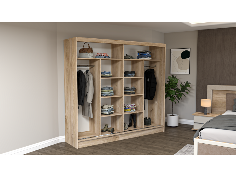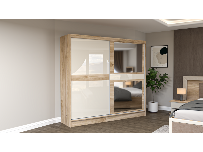 Шиберот изработен од иверка со дебелина 16 мм во кастело даб к-358 (дрвен дезен) и лице Крем МДФ Сјај,со огледало со фазета на едната врата.
