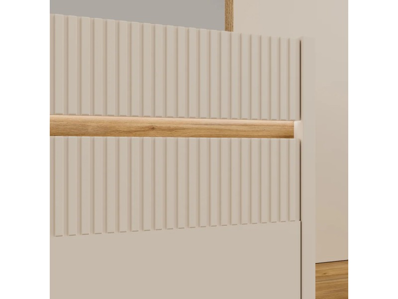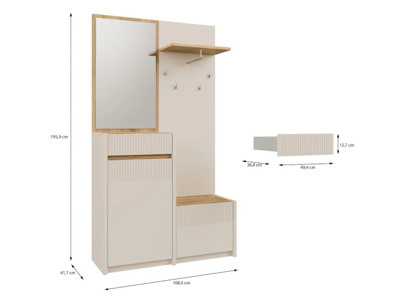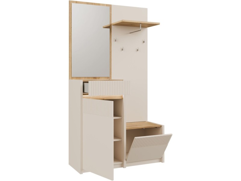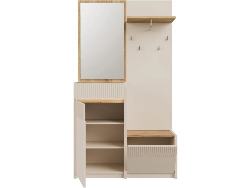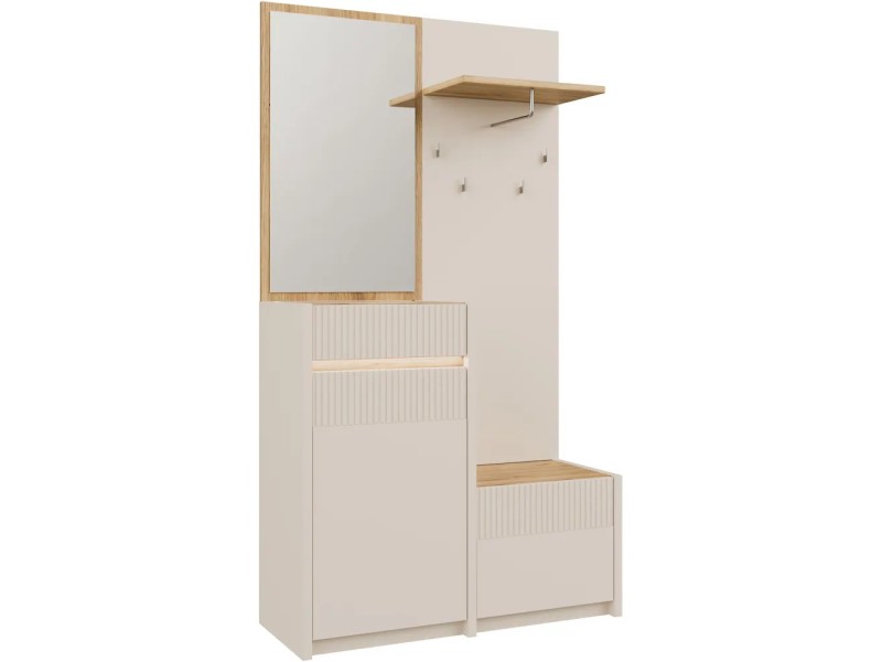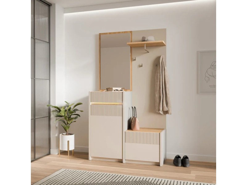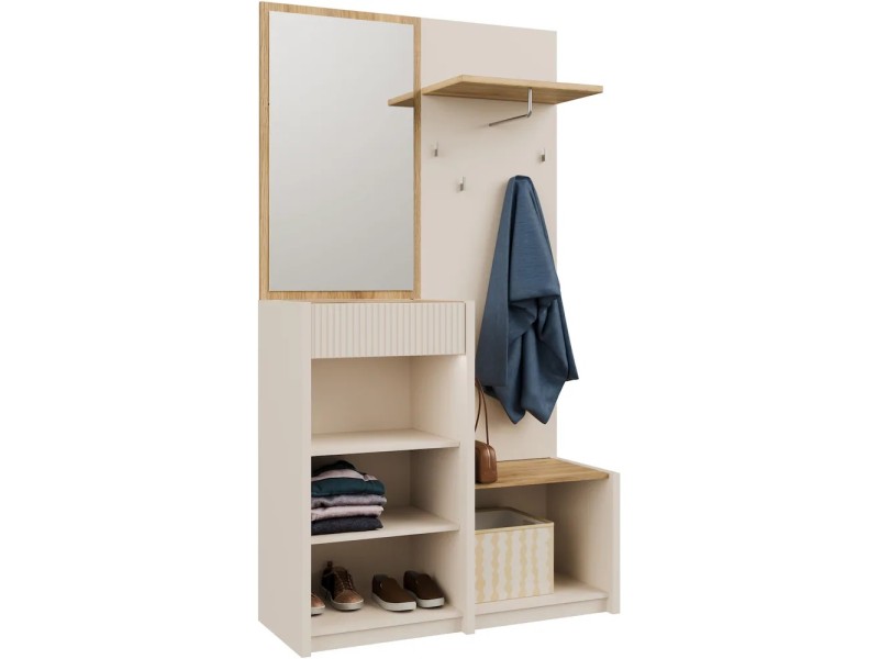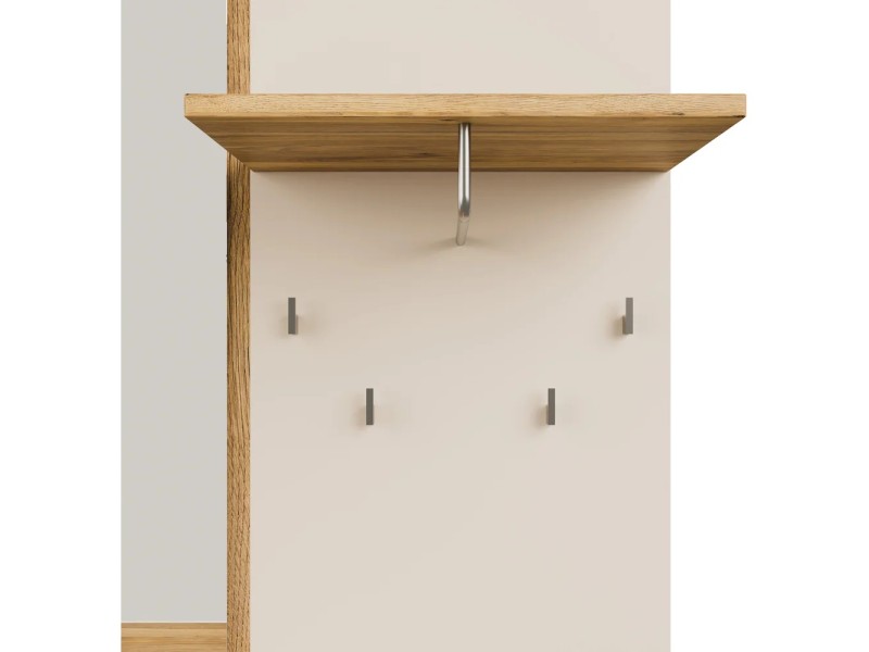 Стилска и функционална закачалка во современа кашмир боја комбинирана со даб, изработена од медијапан. Идеална за модерни ентериери – додава топлина и елеганција во ходникот.